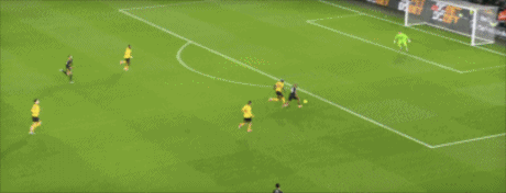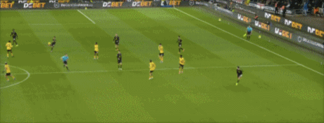 第45+2分钟,沃尔费禁区左侧倒三角传球,贝莱加德中路铲射破门,1-1!狼队扳平。