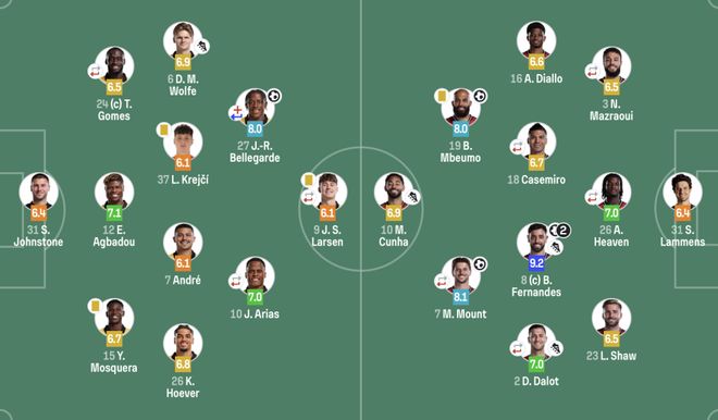 曼联(3421):31-拉门斯;3-马兹拉维(69’6-利马),26-海文(69’15-约罗),23-卢克肖;16-迪亚洛,18-卡塞米罗(78’37-梅努),8-B费,2-达洛特(85’13-多古);18-姆伯莫,7-芒特(85’11-齐尔克泽);10-库尼亚